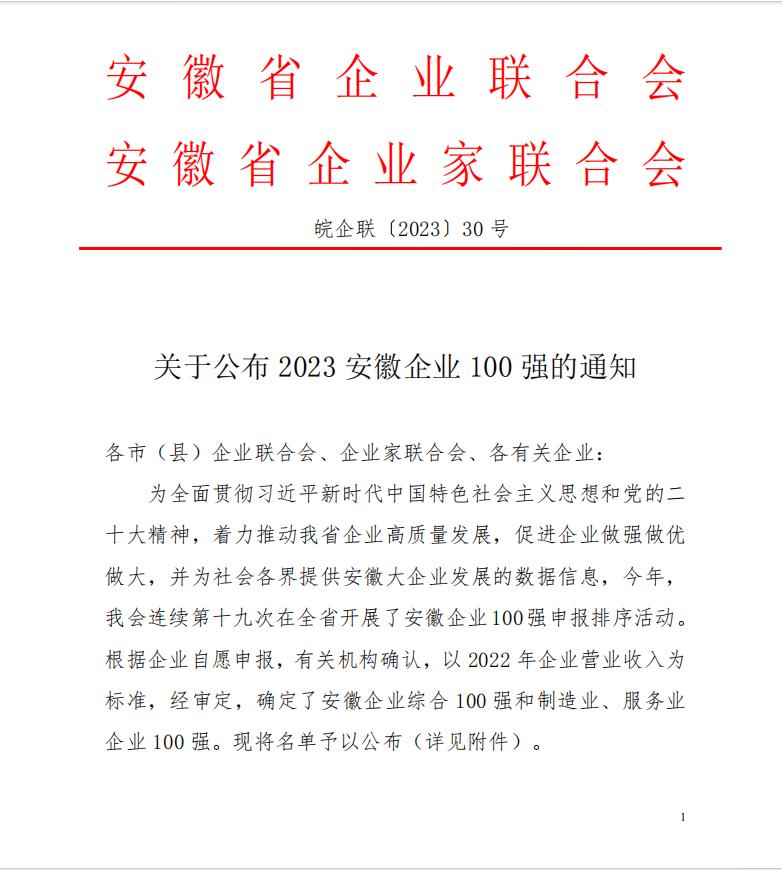 2023年11月22日,安徽省企業(yè)聯(lián)合會(huì)、安徽省企業(yè)家聯(lián)合會(huì)舉辦了2023安徽百?gòu)?qiáng)企業(yè)發(fā)布會(huì)暨企業(yè)家論壇,現(xiàn)場(chǎng)發(fā)布了“2023安徽省百?gòu)?qiáng)企業(yè)”榜單,及“2023安徽省制造業(yè)百?gòu)?qiáng)企業(yè) ”“2023安徽省服務(wù)業(yè)百?gòu)?qiáng)企業(yè)”榜單。該活動(dòng)迄今已經(jīng)連續(xù)開展十九屆,基本囊括了安徽營(yíng)收規(guī)模排在前列的各類企業(yè)。