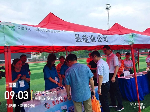 按照統一部署,6月21日早晨,長豐縣鹽業(yè)公司5名工作人員早早就來到了活動現場,帶著《食鹽專營辦法》等宣傳資料、品種鹽樣品及訂制的水杯參加宣傳活動。啟動儀式開始后,首先由縣政協副主席致辭;接著是合肥伊利乳業(yè)有限責任公司代表食品生產企業(yè)作承諾發(fā)言;最后由縣人大副主任宣布“長豐縣2019年食品安全宣傳周暨食品安全長豐行活動正式啟動”并會同場上領導共同按下儀式啟動球?;顒?/FONT>現場人群涌動,氣氛熱烈,長豐公司5名工作人員穿著統一T恤,佩戴著工作證,分別在兩個展臺開展宣傳。主要宣傳《食鹽專營辦法》、講解多品種鹽知識,推崇“吃好鹽 選中鹽”,吃鹽首選“綠色食品鹽”的健康理念。