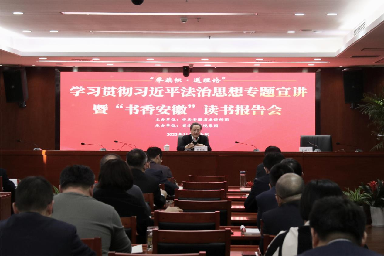11月23日下午,省委講師團“舉旗幟·送理論”學習貫徹習近平法治思想專題宣講暨“書香安徽”讀書報告會走進省生態(tài)環(huán)境集團。報告會邀請省人民檢察院黨組成員、副檢察長、一級高級檢察官陶芳德作專題宣講報告。集團公司黨委及經(jīng)營班子成員,各直屬(控股)公司主要負責人、法務合規(guī)工作分管領(lǐng)導及部門負責人,集團本部中層及以上管理人員參加報告會。