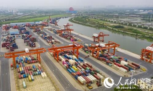 安徽省港航集團(tuán)旗下的合肥港國(guó)際集裝箱碼頭。人民網(wǎng) 張俊攝