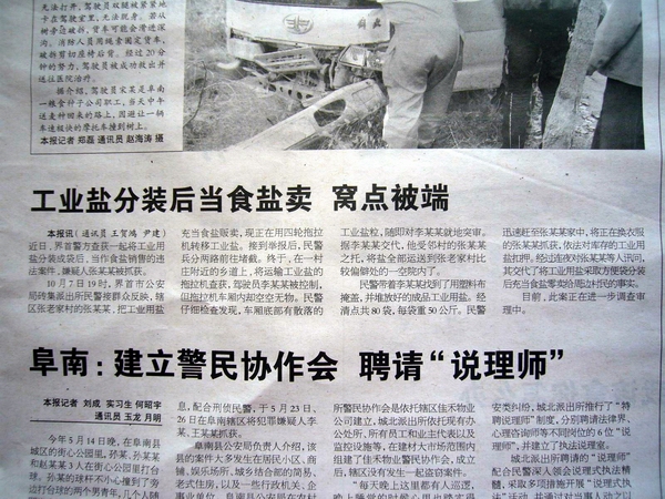 10月7日19時,界首市公安局磚集派出所民警接群眾反映,轄區(qū)張老家村的張某某,把工業(yè)用鹽充當食鹽販賣,現(xiàn)正在用四輪拖拉機轉移工業(yè)鹽。接到舉報后,民警兵分兩路前往堵截。終于,在一村莊附近的鄉(xiāng)道上,將運輸工業(yè)鹽的拖拉機查獲,駕駛員李某某被控制,但拖拉機車廂內卻空空無物。民警仔細檢查發(fā)現(xiàn),車廂底部有散落的工業(yè)鹽粒,隨即對李某某就地突審。據(jù)李某某交代,他受鄰村的張某某之托,將鹽全部運送到張老家村比較偏僻處的一空院內了。
