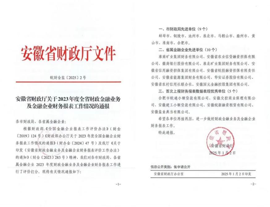 近日,安徽省財(cái)政廳依據(jù)《全國金融企業(yè)報(bào)表工作評(píng)價(jià)辦法》等相關(guān)文件精神,對(duì)各市財(cái)政局和省屬金融企業(yè)2023年度財(cái)政金融業(yè)務(wù)及金融企業(yè)財(cái)務(wù)報(bào)表工作進(jìn)行了評(píng)價(jià)?;整}典當(dāng)公司榮獲“首次上報(bào)財(cái)務(wù)報(bào)表數(shù)據(jù)表現(xiàn)優(yōu)秀單位”榮譽(yù)稱號(hào)。